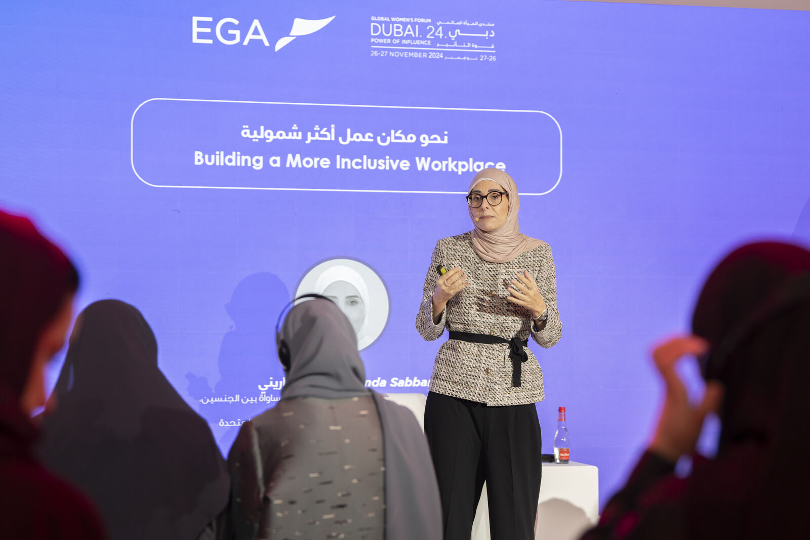 وركزت صباريني على جانبين في مجال تجميع البيانات: الأول تجميع البيانات في مجال الموارد البشرية، والثاني البيانات المصنفة حسب النوع الاجتماعي في مكان العمل للتعرف على مدى توفر بيئة العمل الآمنة للمرأة، مؤكدةً أن توفر هذه البيانات يساعد كثيراً في دفع عجلة التوازن بين الجنسين في مكان العمل.
